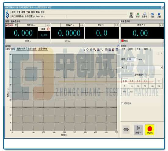 电气软件由驱动系统和测量控制部分组成,微机控制实现各种控制(自动控制和手动控制)、显示(曲线、扭矩、扭转角度等)、数据采集(根据不同的需要进行设置试验速度、扭转角度等)、处理(自动保存曲线)、特性曲线(扭矩—时间曲线、扭矩—角度曲线)的绘制等功能;扭矩传感器实现对试件扭矩的测试,光电编码器实现对试件扭转角度的测量。