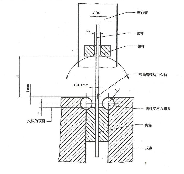 4、夹块的夹待面应稍突出干圆柱支座但不超过0.1mm,既测是两圆柱支座的曲率中心连线上试样与圆柱柱支座间的间隔不大于0.1mm。
