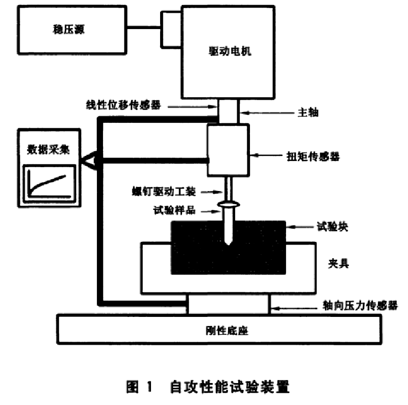 用于侧定轴向自攻力的试验装里如图1所示。试验装置应包括一个可变速电动机,能持续不断地驱动主轴。主轴在连续旋转的同时可作轴向运动以提供可变的轴向力。试验装t和主轴应具有足够的刚度,从而保证在试验加载的条件下既不会发生偏转也不会产生变形。此外,试验装置应包括一个试验块夹具以固定试验块,且能够持续地监洲和记录螺钉试验过程中产生的力、扭矩和轴向位移,并在计算过程中对力、扭矩和轴向位移的范围进行标定。