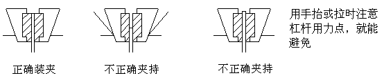 作拉伸试样时,先开动油泵拧开送油阀,使工作活塞升起一约5mm,然后关闭送油阀,将试样一端夹于上钳口,测力仪清零,再调整下钳口,夹持试样下端,即可开始试验,夹持试样时,应按钳口所刻的尺寸范围夹持试样。试样应该夹在钳口的全长上,两块钳口位置必须一致,并对准中央加以充分固定(参看下图)。