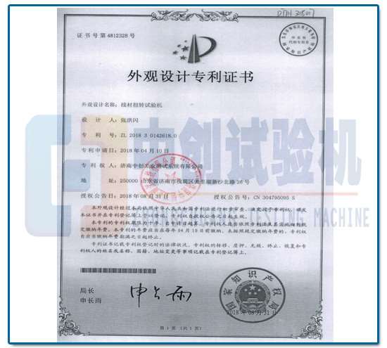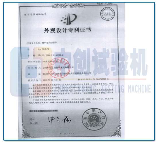 • 材料扭转试验机外观专利证书材料扭转试验机外观专利证书
